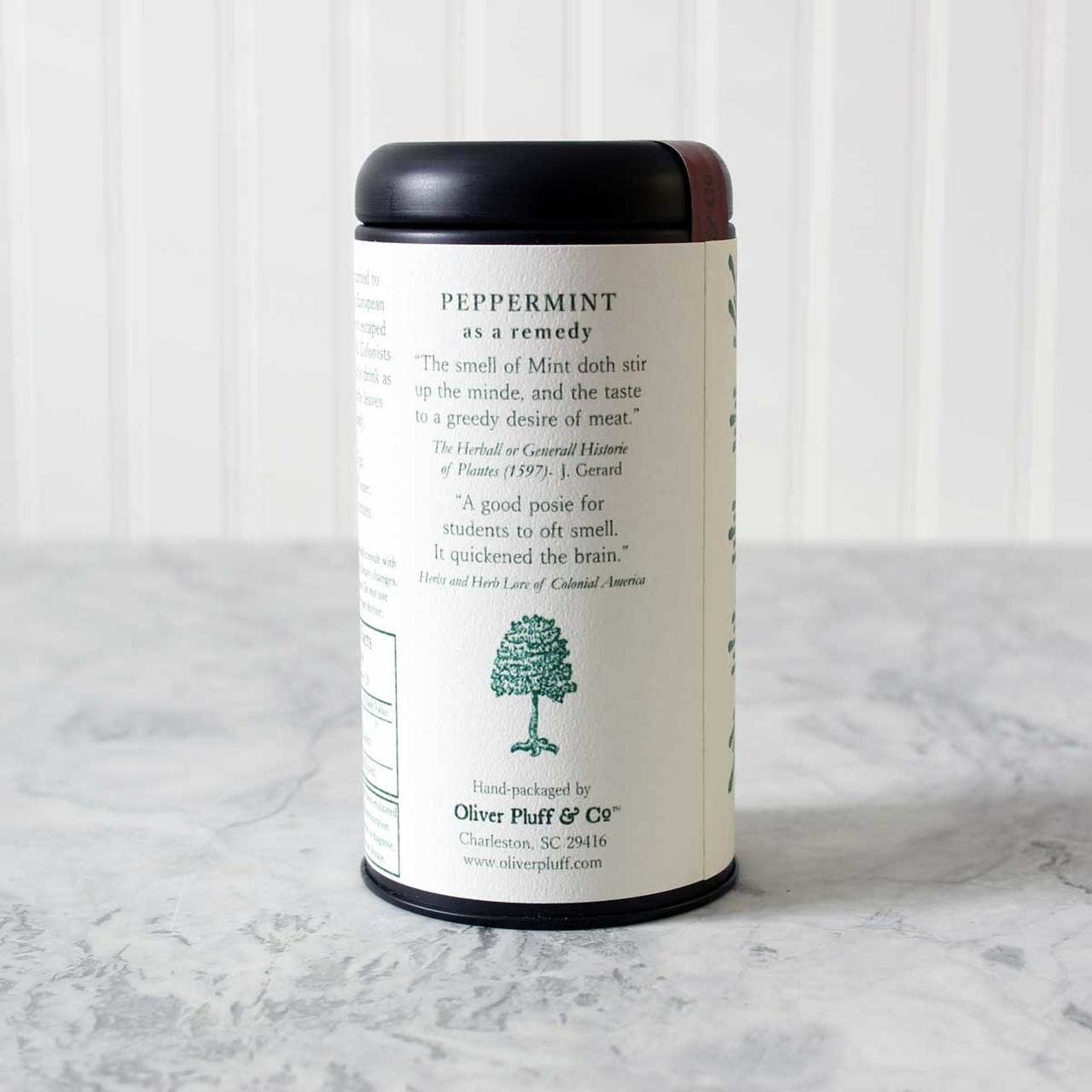 Peppermint - 20 Teabags Quickens the Occasional Absent Minde (Increases Alertness)* Description: “The smell of Mint doth stir up the minde, and the taste to a greedy desire of meat.” (The Herball or Generall Historie of Plantes (1597) - J. Gerard). “A good posie for students to oft smell. It quickened the brain.” (Herbs and Herb Lore of Colonial America). Peppermint was carried to the New World by European immigrants, where it escaped and grew in the wild. Colonists steeped peppermint to drink as a tea or sugared the leaves to eat as candy. * Please be advised: You should consult with your doctor before making dietary changes. Pregnancy and Lactation: Do not use without the advice of your doctor. Ingredients: Peppermint leaves Size/Type: 20 Pyramid style teabags sealed in matte black signature tin Shelf Life: 3 Years Hand-packaged by Oliver Pluff & Co. in Charleston, South Carolina.